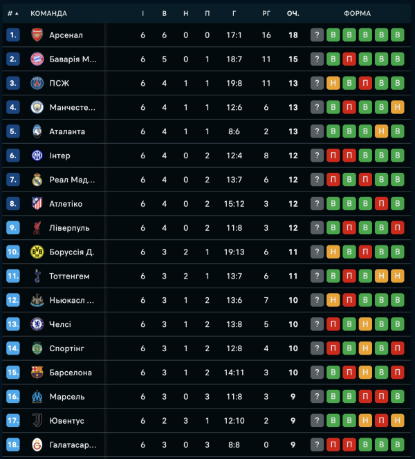Наразі на чолі турнірної таблиці перебувають одноосібно перебуває “Арсенал”, який набрав максимальні 18 очок. Також у топ-8 перебувають “Баварія”, “ПСЖ”, “Манчестер Сіті”, “Аталанта”, “Інтер”, “Реал” та “Атлетіко”.