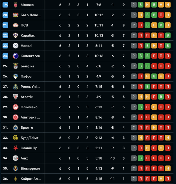 Турнірна таблиця Ліги чемпіонів 2025/26 після 6-го туру основного етапу: