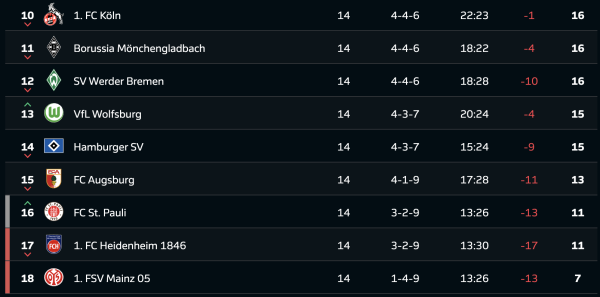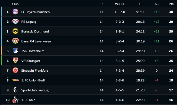 Турнірна таблиця Бундесліги після 14-го туру: