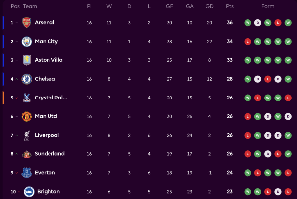 “Арсенал” очолює турнірну таблицю АПЛ, набравши 36 очок. Топ-5 доповнюють “Манчестер Сіті”, “Астон Вілла”, “Челсі” та “Крістал Пелас”.