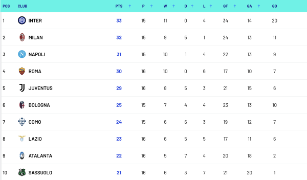 “Інтер” є лідером турнірної таблиці Серії А, набравши 33 залікові бали. “Мілан”, “Наполі”, “Рома” та “Ювентус” доповнюють чільну п’ятірку.