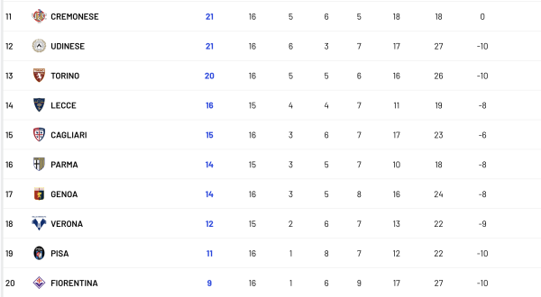 Турнірна таблиця Серії А після 16-го туру: