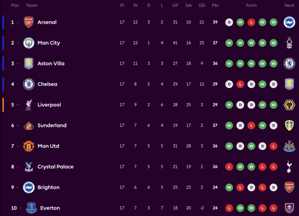 “Арсенал” очолює турнірну таблицю АПЛ, набравши 39 очок. Топ-5 доповнюють “Манчестер Сіті”, “Астон Вілла”, “Челсі” та “Ліверпуль”.