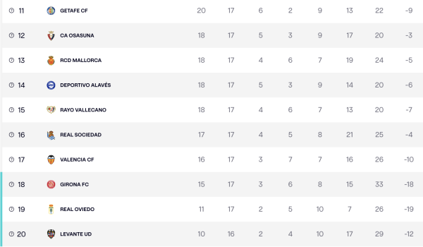 Турнірна таблиця Ла Ліги після 17-го туру: