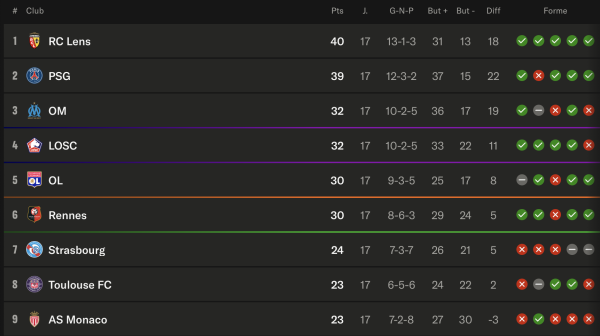 “Ланс” продовжує очолювати турнірну таблицю Ліги 1, набравши 40 балів після 17 турів. “ПСЖ”, “Марсель”, “Лілль” та “Ліон” ідуть слідом.