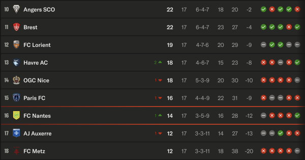 “Нант” перебуває в зоні перехідних матчів, а “Осер” та “Мец” – у зоні вильоту.