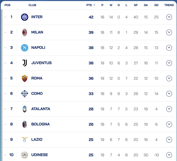 “Інтер” є лідером турнірної таблиці Серії А, набравши 42 залікові бали. “Мілан”, “Наполі”, “Ювентус” та “Рома” доповнюють чільну п’ятірку.