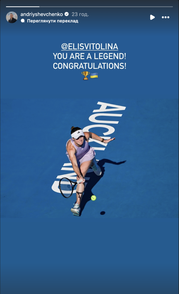 Президент Української асоціації футболу Андрій Шевченко привітав першу ракетку України Еліну Світоліну з перемогою на турнірі WTA в Окленді.