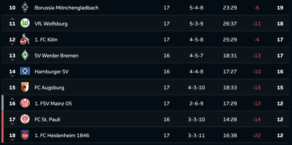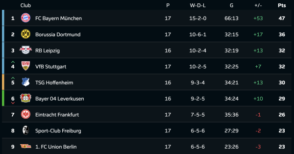 Турнірна таблиця Бундесліги після 17-го туру