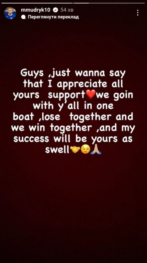 “Друзі, я хотів би сказати, що ціную вашу підтримку. Ми всі з вами в одному човні: ми програємо разом та виграємо разом. І успіх теж буде належати вам”, – написав Мудрик.